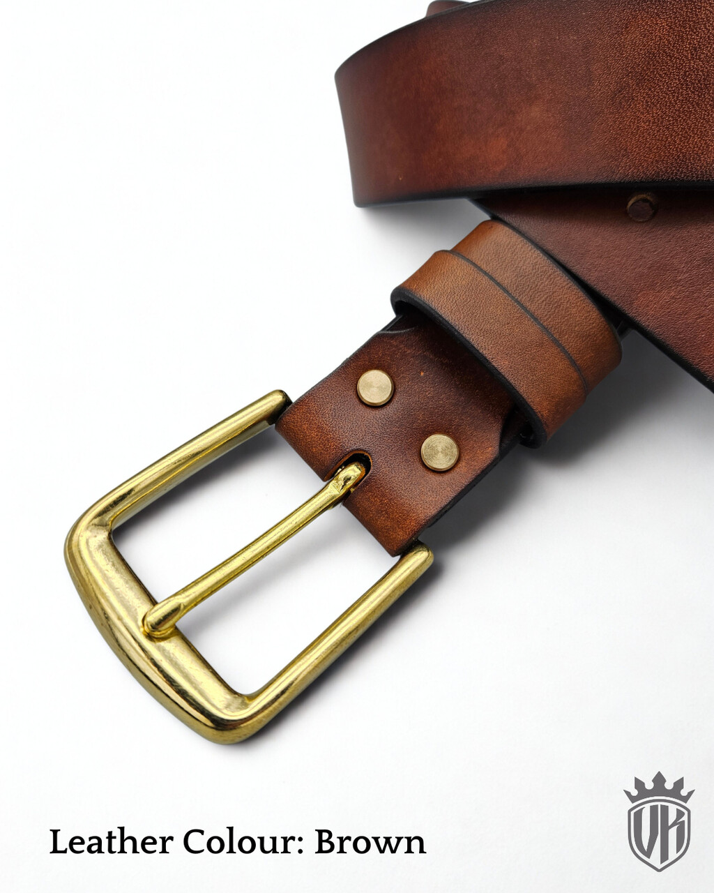 Klamra mocowana jest do paska za pomocą dodatkowego skórzanego elementu i udziale skręcalnych nitów, które również wykonane są z mosiądzu.