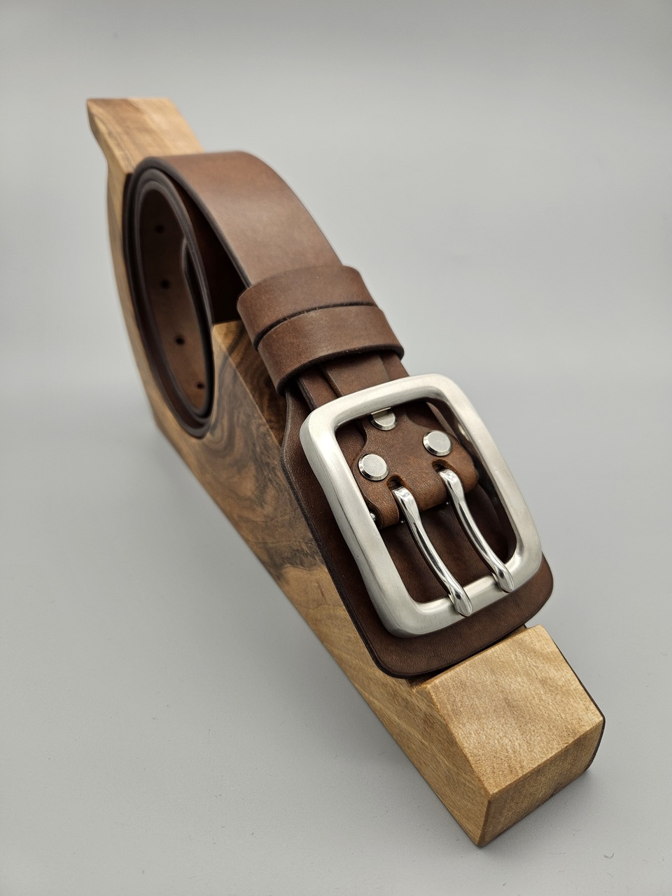 Bazę stanowi, naturalna skóra bydlęca pochodząca z polskiej garbarni. Pasek wykonany jest ręcznie z jednego kawałka skóry, bezpośrednio ciętego z kruponu bydlecego, grubości około 4mm. Szerokość to 38mm, dostosowana do klamry, której szerokość wynosi 4cm.